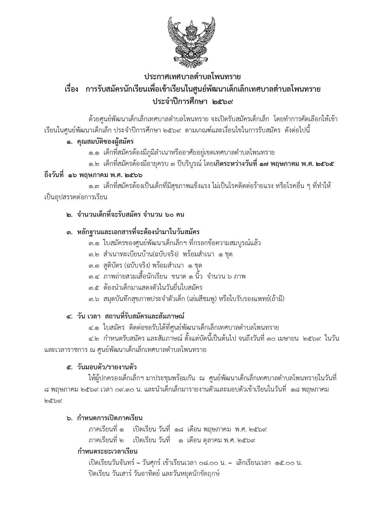 ประกาศเทศบาลตำบลโพนทราย เรื่อง การรับสมัครนักเรียนเพื่อเข้าเรียนในศูนย์พัฒนาเด็กเล็กเทศบาลตำบลโพนทราย ประจำปีการศึกษา 2569