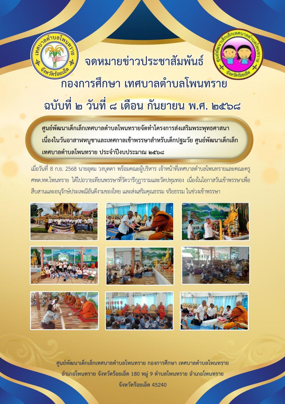 โครงการส่งเสริมพระพุทธศาสนาเนื่องในวันอาสาฬหบูชาและเทศกาลเข้าพรรษาสำหรับเด็กปฐมวัย ศูนย์พัฒนาเด็กเล็กเทศบาลตำบลโพนทราย ประจำปี 2568[8 กันยายน 2568]