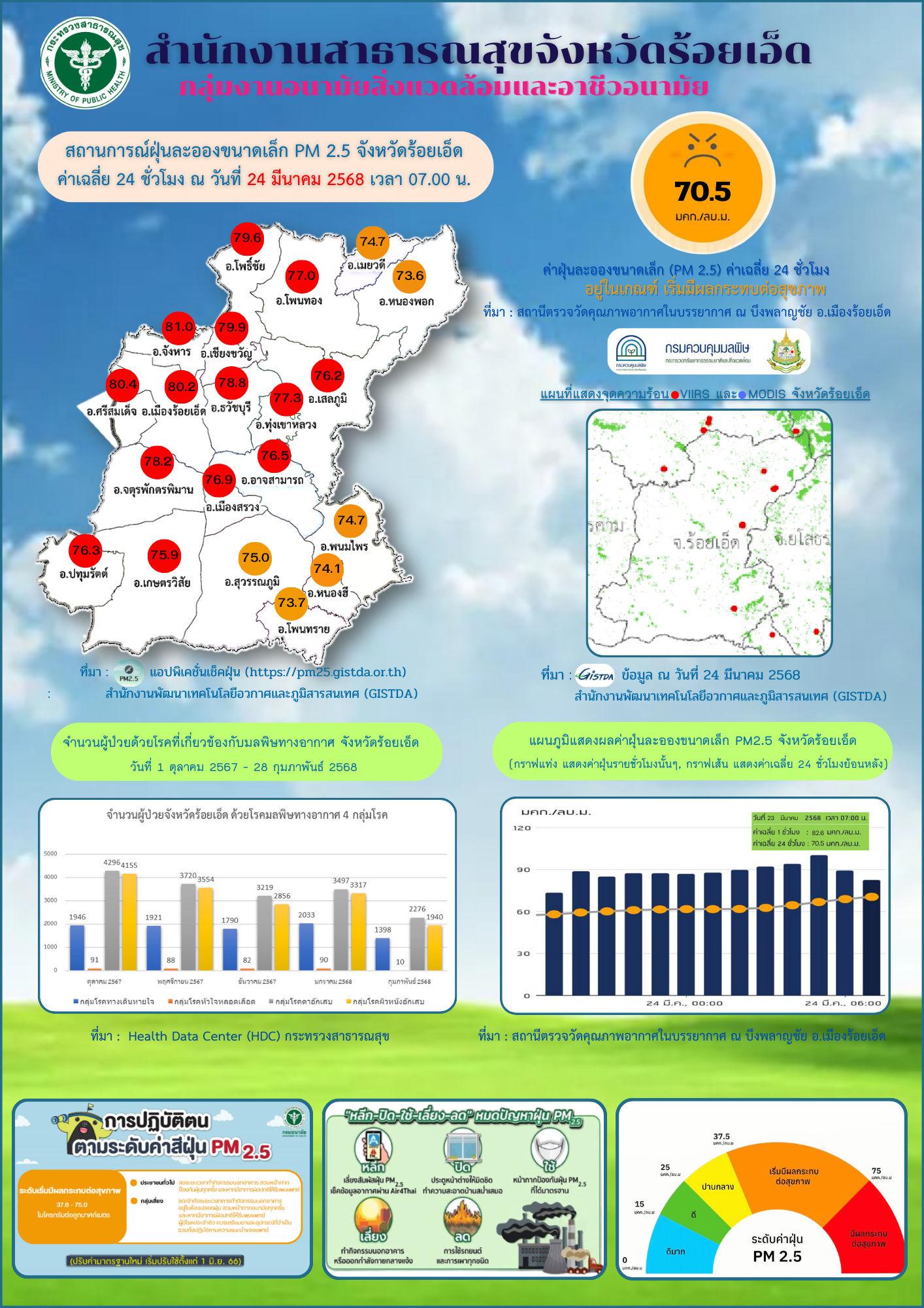 ชื่อเรื่อง : รายงานสถานการณ์ฝุ่นละอองขนาดเล็ก (PM2.5) จังหวัดร้อยเอ็ด เดือนมีนาคม 2568