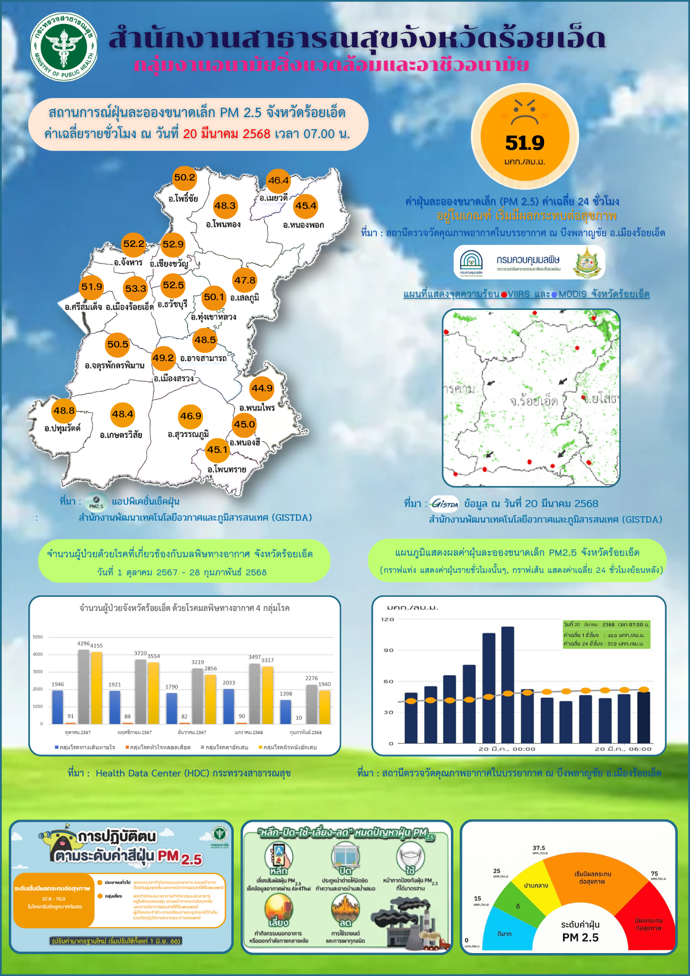 รายงานสถานการณ์ฝุ่นละอองขนาดเล็ก (PM2.5) จังหวัดร้อยเอ็ด เดือนมีนาคม 2568