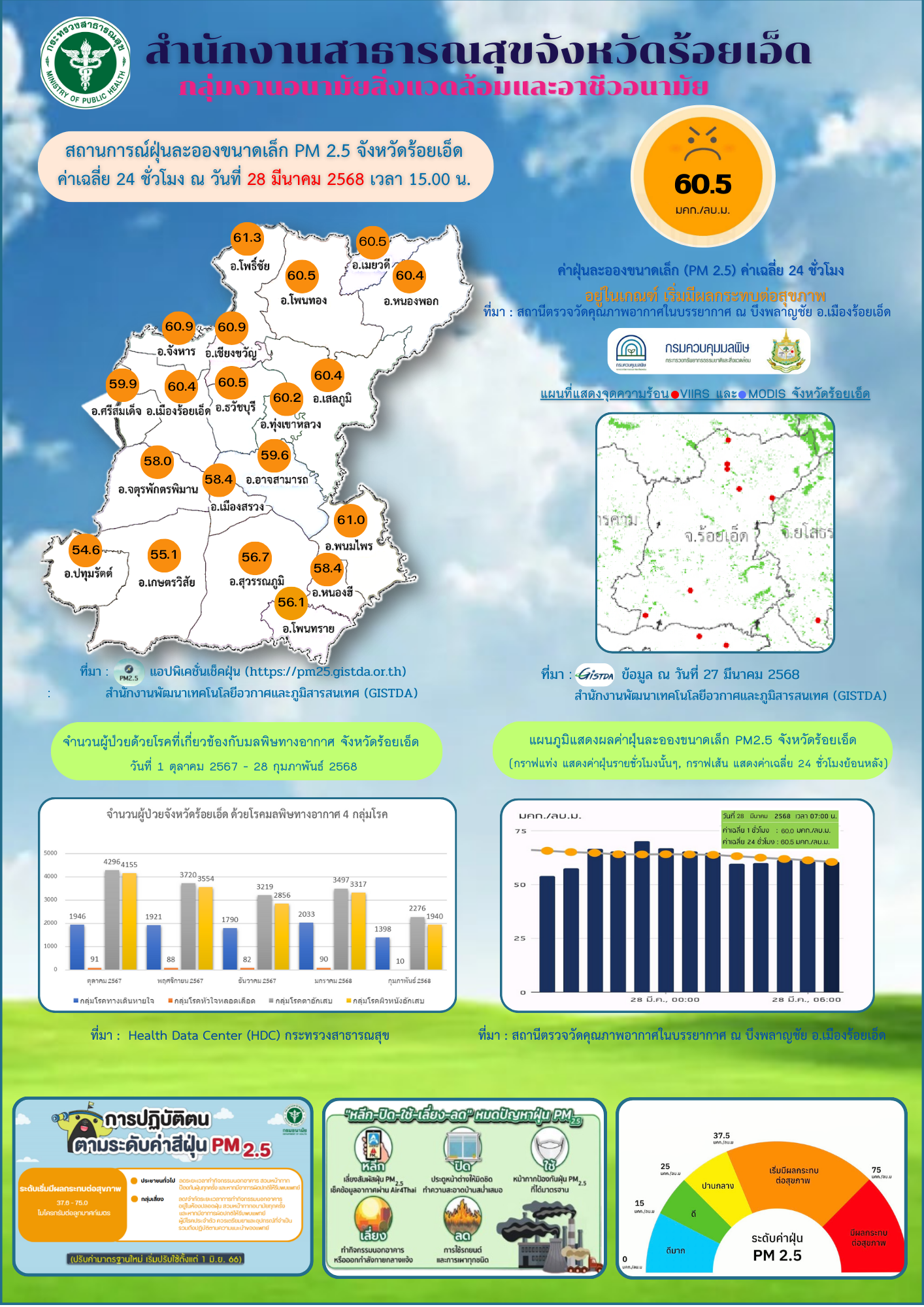 รายงานสถานการณ์ฝุ่นละอองขนาดเล็ก (PM2.5) จังหวัดร้อยเอ็ด เดือนมีนาคม 2568