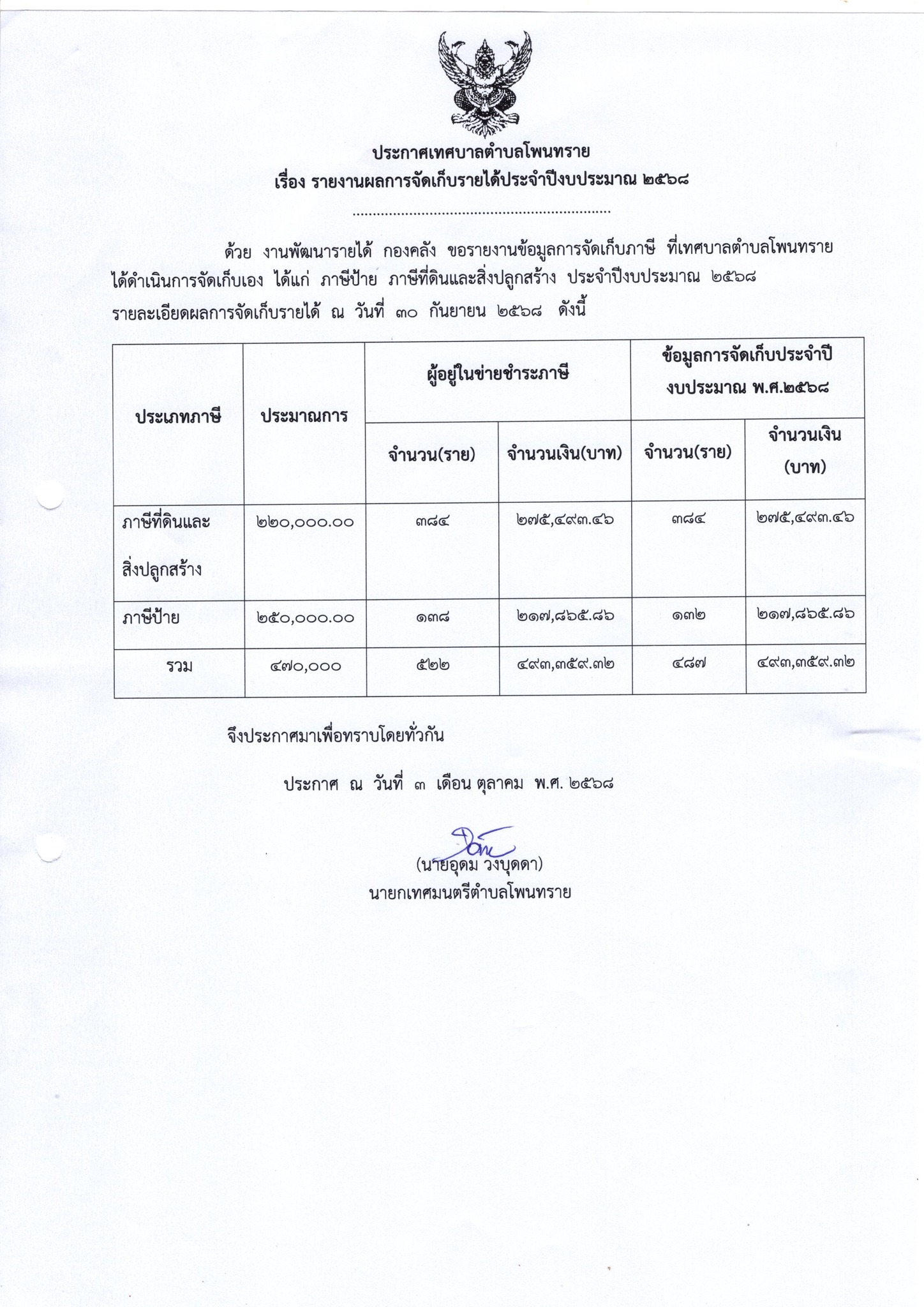 รายละเอียด : ประกาศ เทศบาลตำบลโพนทราย เรื่อง รายงานผลการจัดเก็บรายได้ ประจำปีงบประมาณ 2568 ได้แก่ ภาษีที่ดินและสิ่งปลูกสร้าง และ ภาษีป้าย