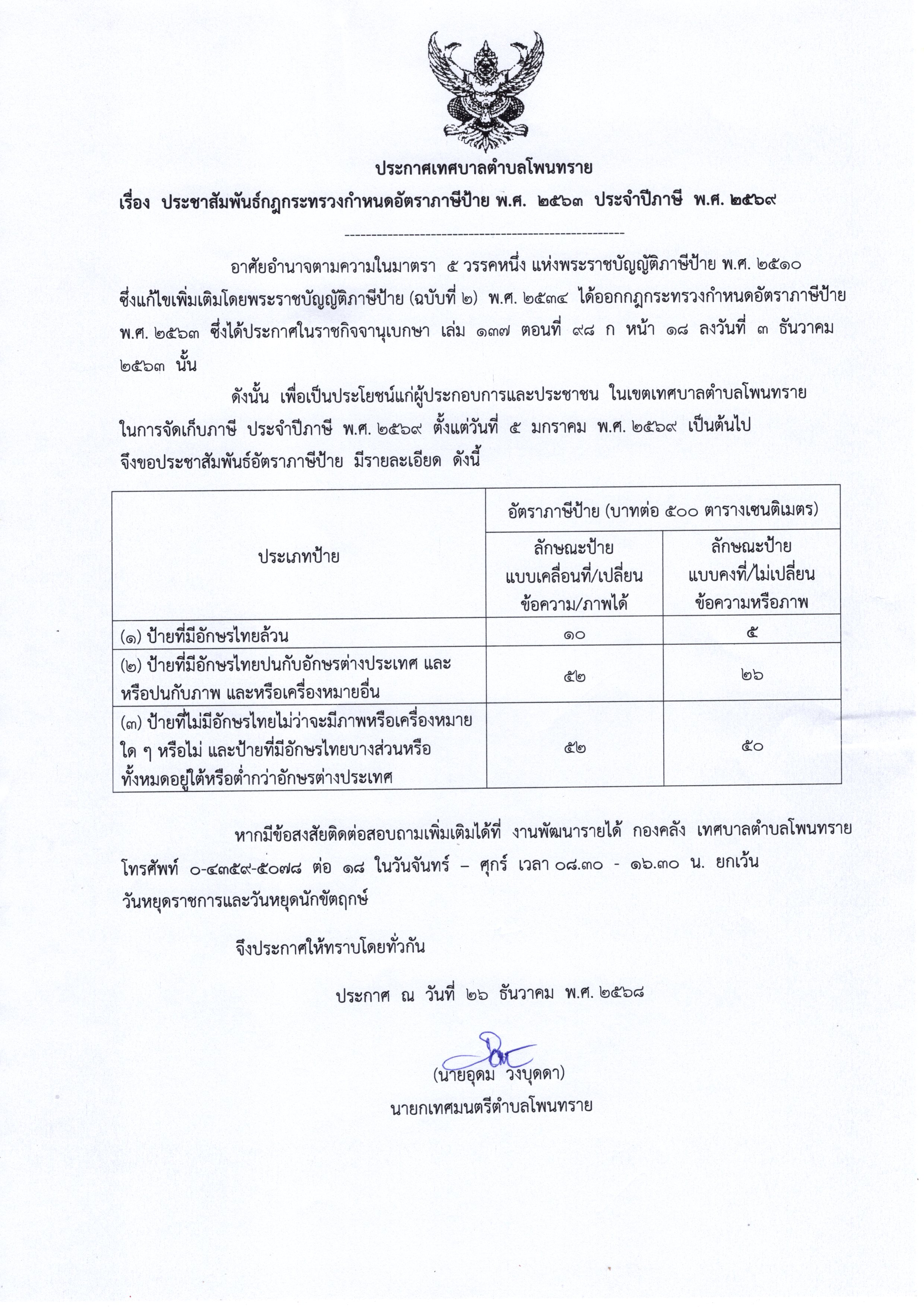 ประชาสัมพันธ์กฎกระทรวงกำหนดอัตราภาษีป้าย พ.ศ.2563 ประจำปีภาษี พ.ศ.2569