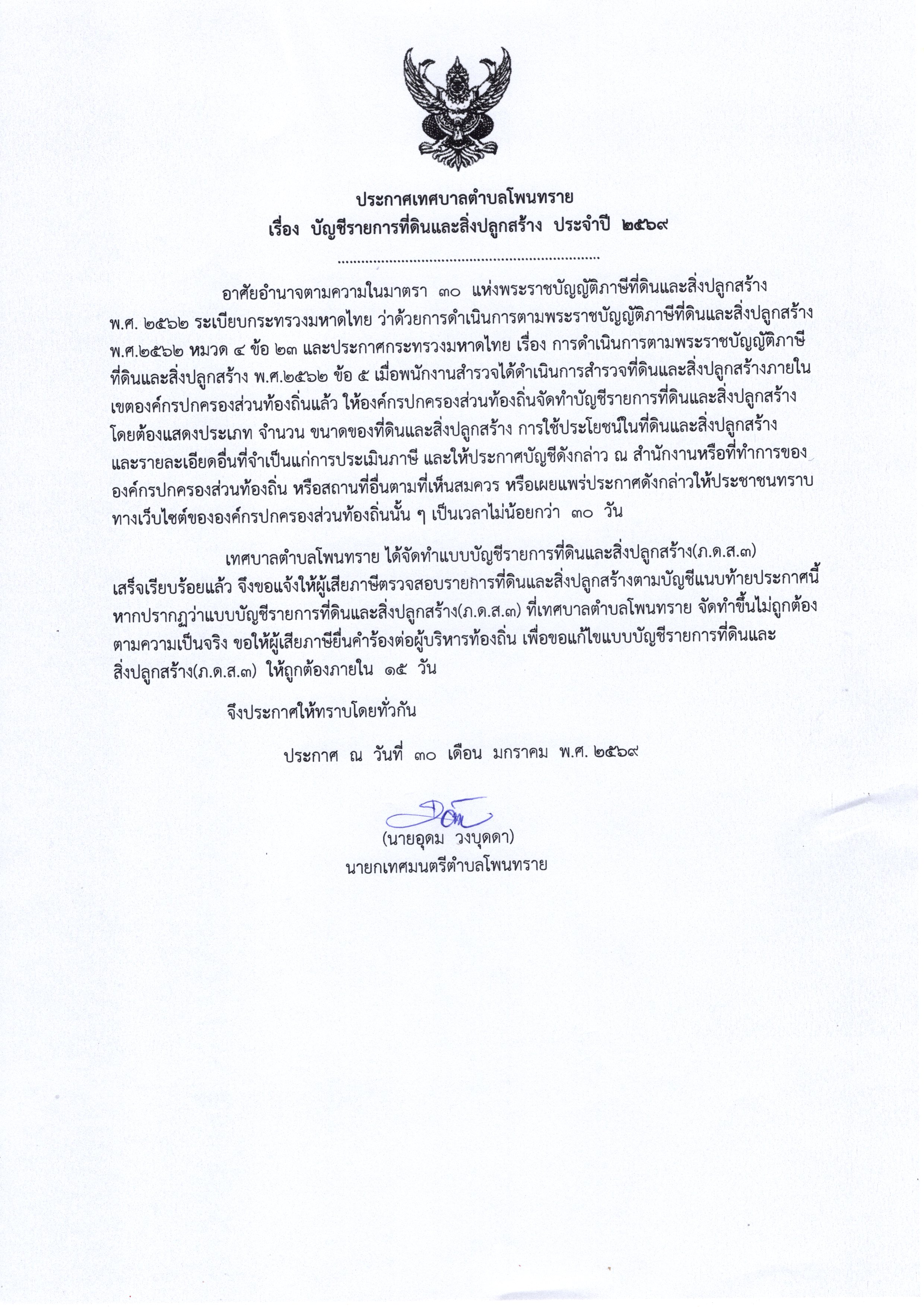 บัญชีรายการที่ดินและสิ่งปลูกสร้าง ประจำปี 2569